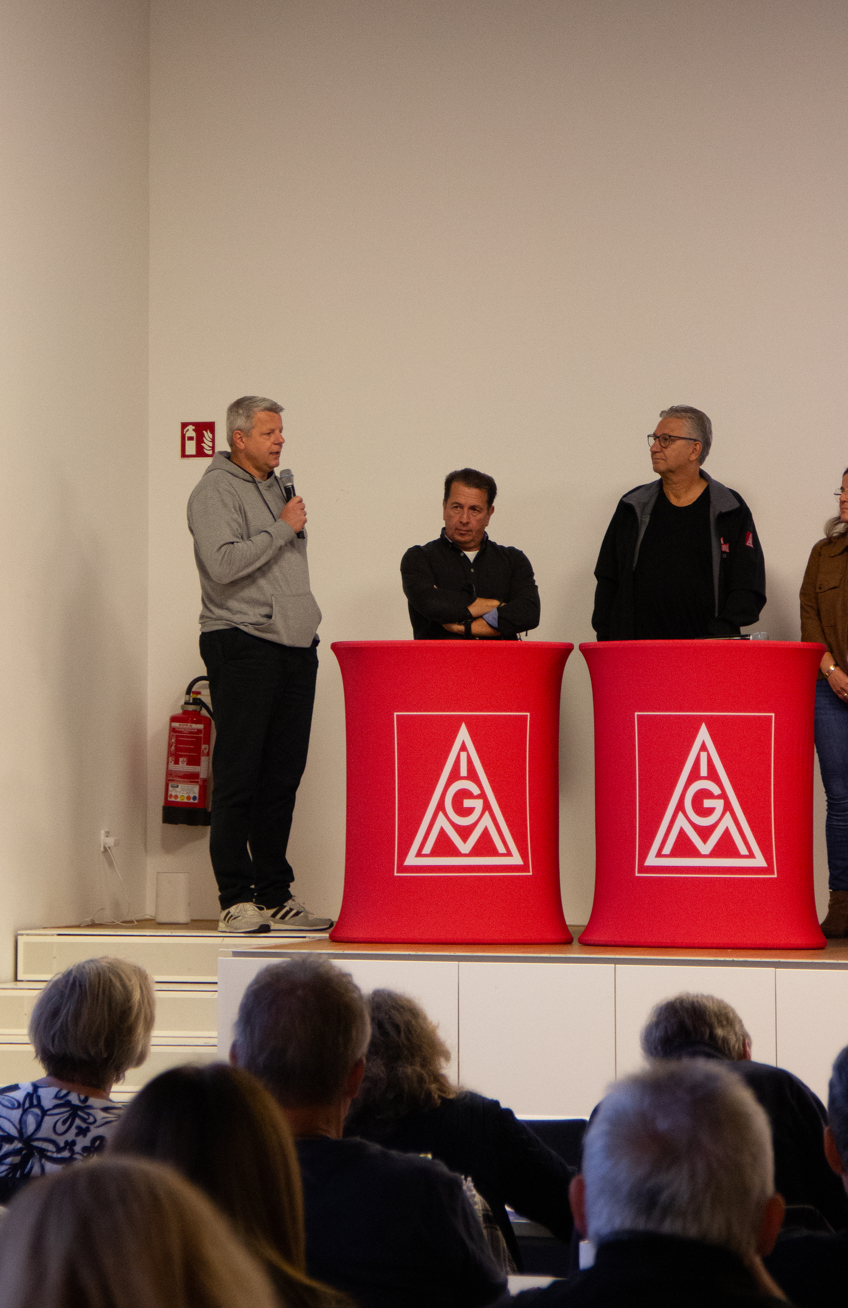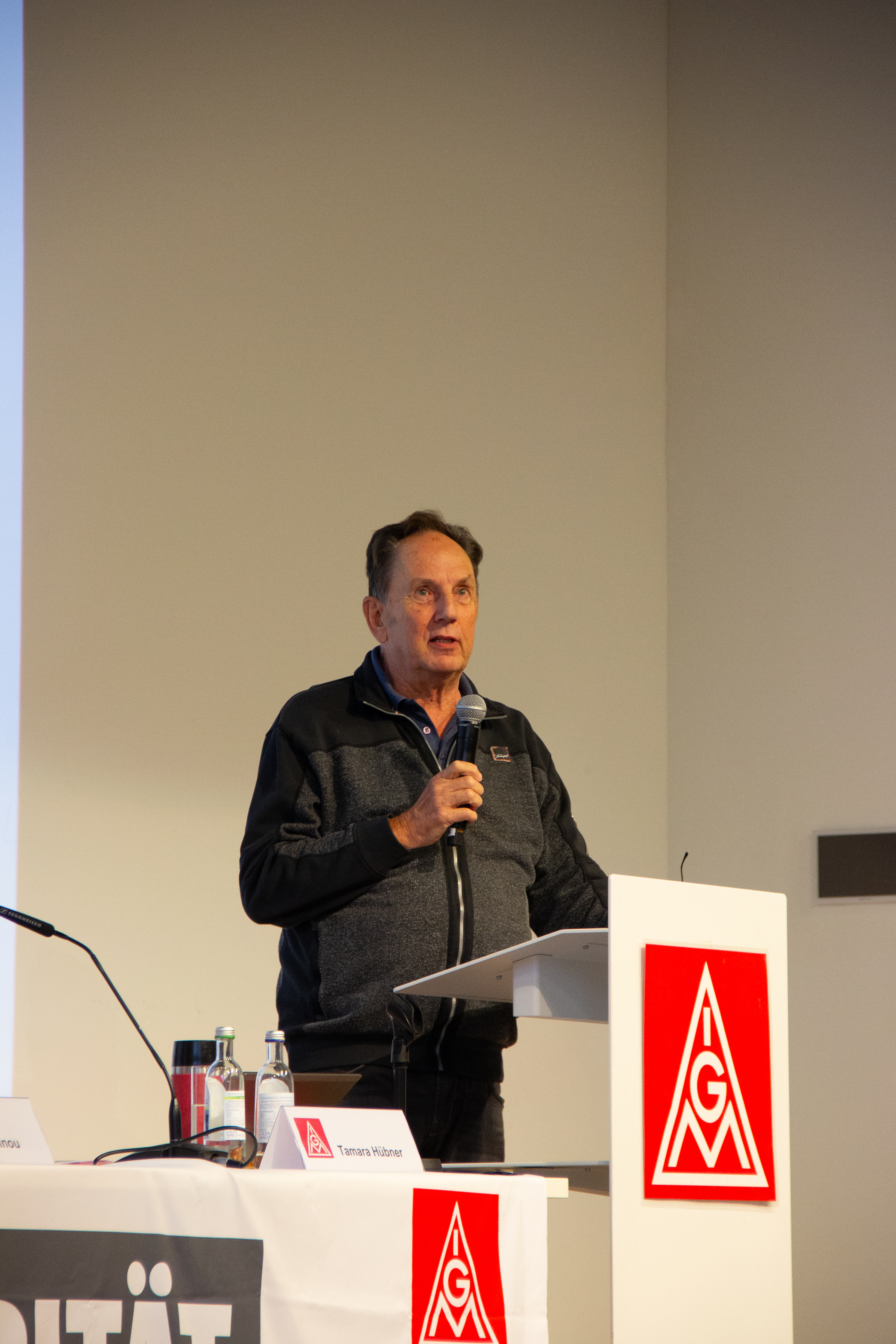 Michael Häberle, Betriebsratsvorsitzender am Mercedes-Benz Standort Untertürkheim und Edwin Krieg, Betriebsrat am Mercedes-Benz Standort Sindelfingen, berichteten über die Einführung und Wirkung des Mitgliederbonus: Mit der sogenannten „ZUSI 2035“ wurde nicht nur die Beschäftigungssicherung bei Mercedes-Benz verlängert, sondern erstmalig auch ein Mitgliederbonus für IG Metall-Mitglieder im Betrieb durchgesetzt: Ab 2026 erhalten IG Metall-Mitglieder bei Mercedes-Benz bei der Wandlung von T-ZUG-Tagen einen zusätzlichen freien Tag. Das bedeutet, statt der bisherigen 6 oder 8 freien Tage gibt es künftig 6+1 bzw. 8+1 Tage. Ein klarer Vorteil für alle, die gewerkschaftlich organisiert sind.