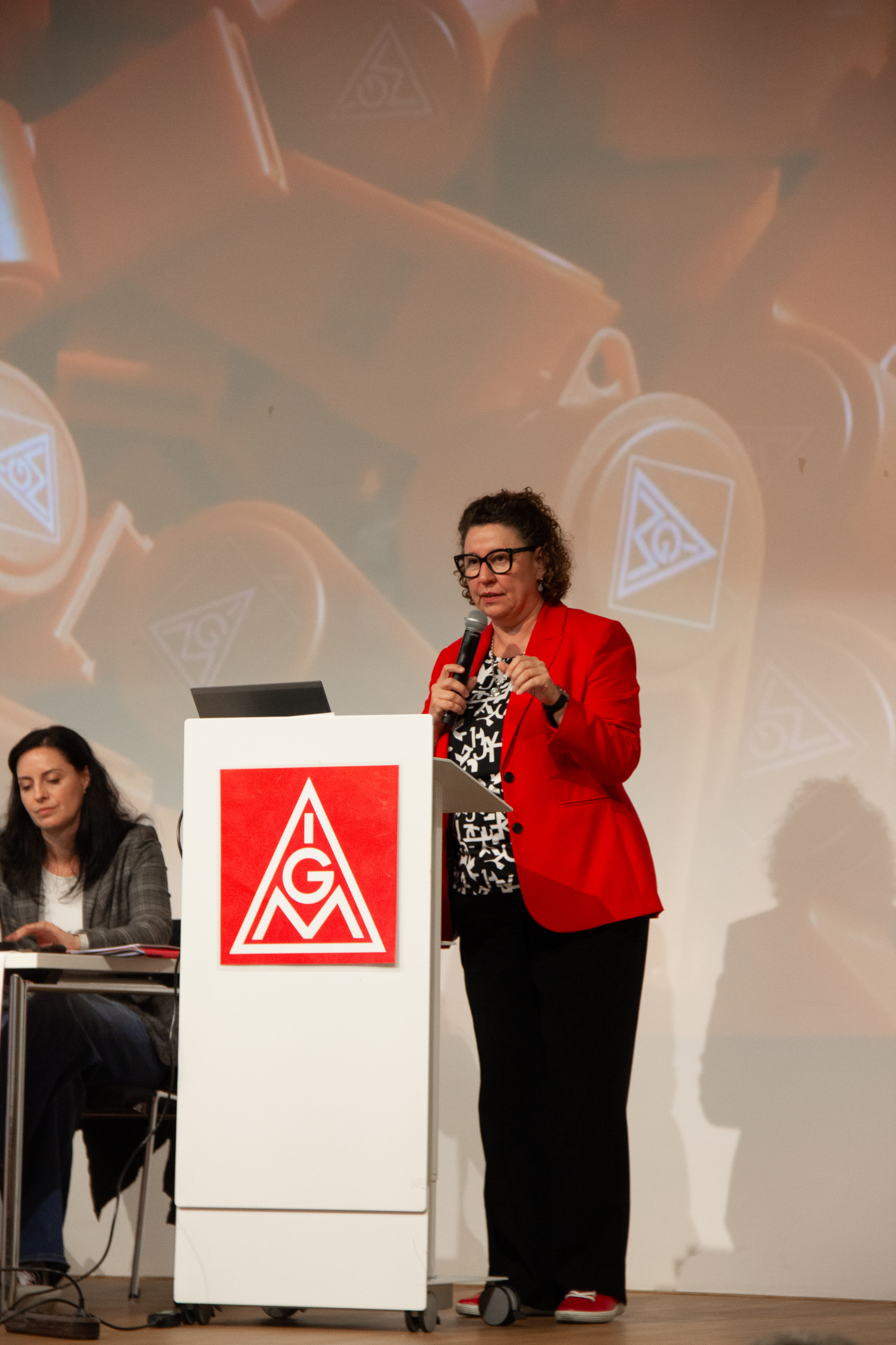 Ljiljana Culjak, Betriebsratsvorsitzende bei MAHLE Thermal und Fluid Systems berichtete über den aktuellen Stand der Umsetzung des Zukunftstarifvertrags bei Mahle. Der Zukunftstarifvertrag ermöglicht es Beschäftigten und Betriebsräten an allen deutschen Standorten, ihre Kompetenzen und Ideen direkt in die Entwicklung neuer Produkte und Geschäftsmodelle einzubringen.