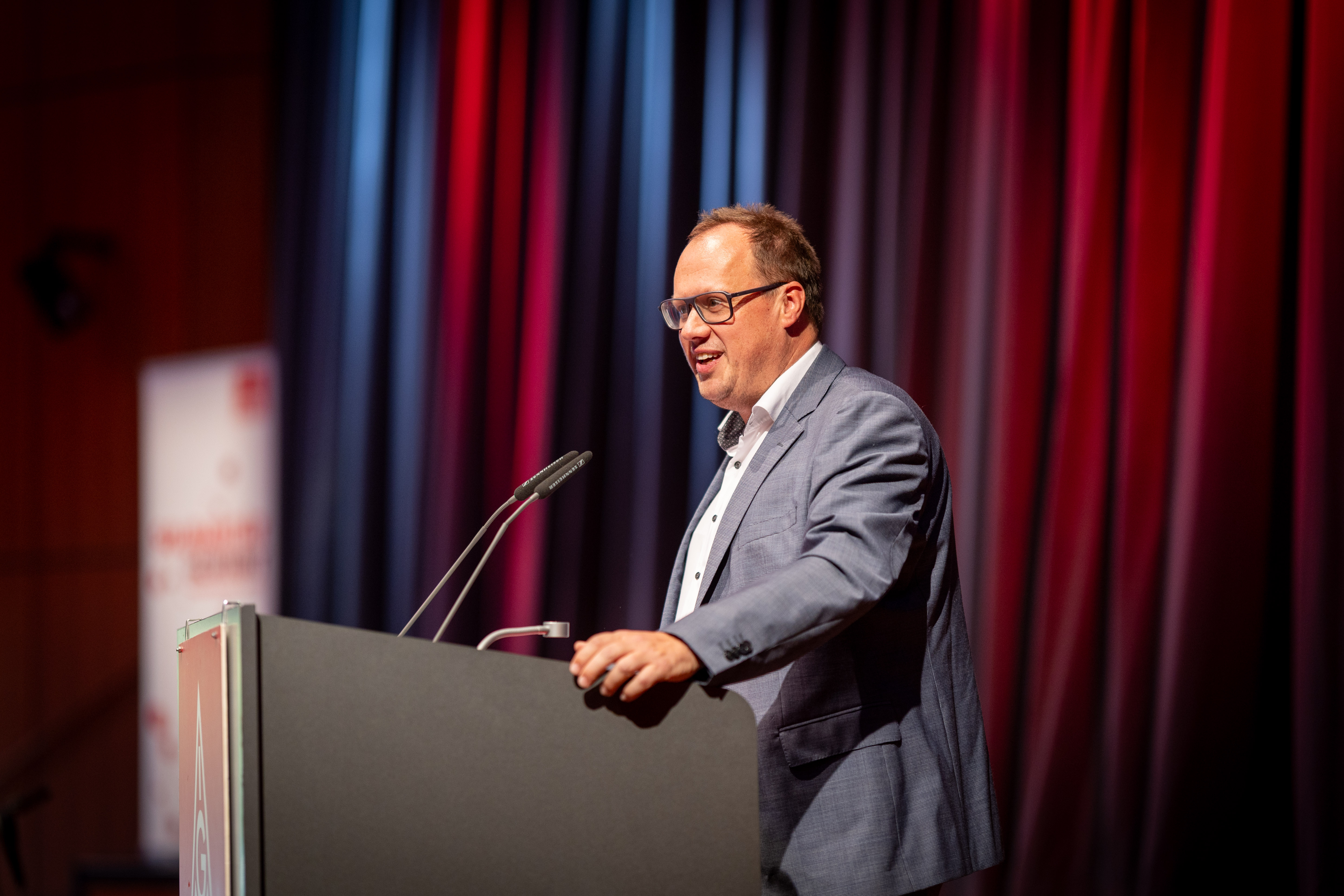 Kai Burmeister, Vorsitzender des DGB Baden-Württemberg unterstrich in seiner Festrede die Bedeutung von Gewerkschaften als Treiber für gesellschaftlichen Fortschritt: „Gute Löhne, gute Renten und ein starker Sozialstaat: das sind die großen Erfolge der Gewerkschaftsbewegung. Dafür sage ich heute Danke! Diese Erfolge müssen immer wieder neu errungen werden. Wir stehen für Gerechtigkeit. Als DGB setzen wir uns für mehr Tarifverträge ein. Es ist alarmierend, dass nur noch jede/-r zweite Beschäftigte von einem Tarifvertrag profitiert. Um dies zu ändern, braucht es von der Politik ein Tariftreuegesetze kommen – damit werden öffentliche Aufträge nur an tarifgebundene Unternehmen vergeben! Wir Gewerkschaft werden auch nicht locker lassen bei der Rente: Rente muss für alle zum guten Leben reichen. Das ist eine Frage des Respektes vor der Lebensleistung der Beschäftigten.“