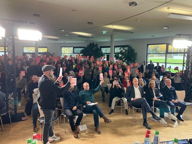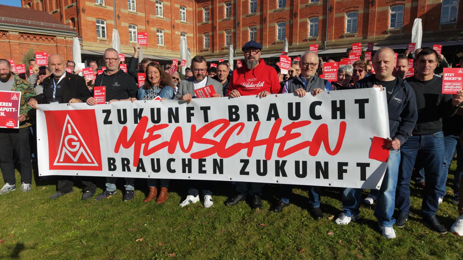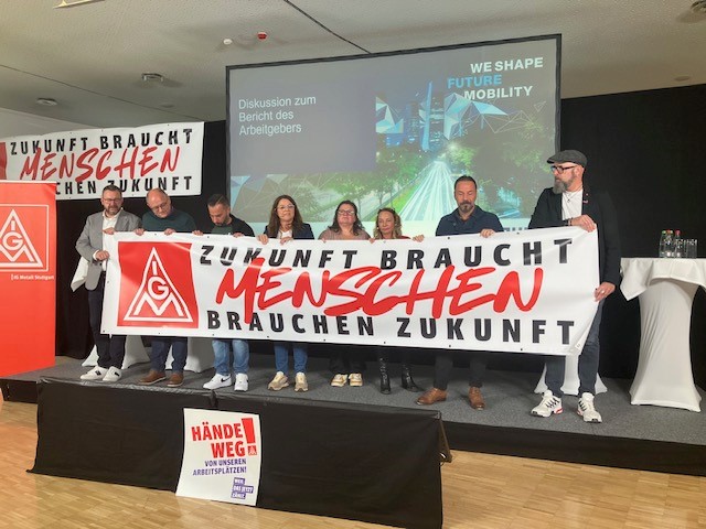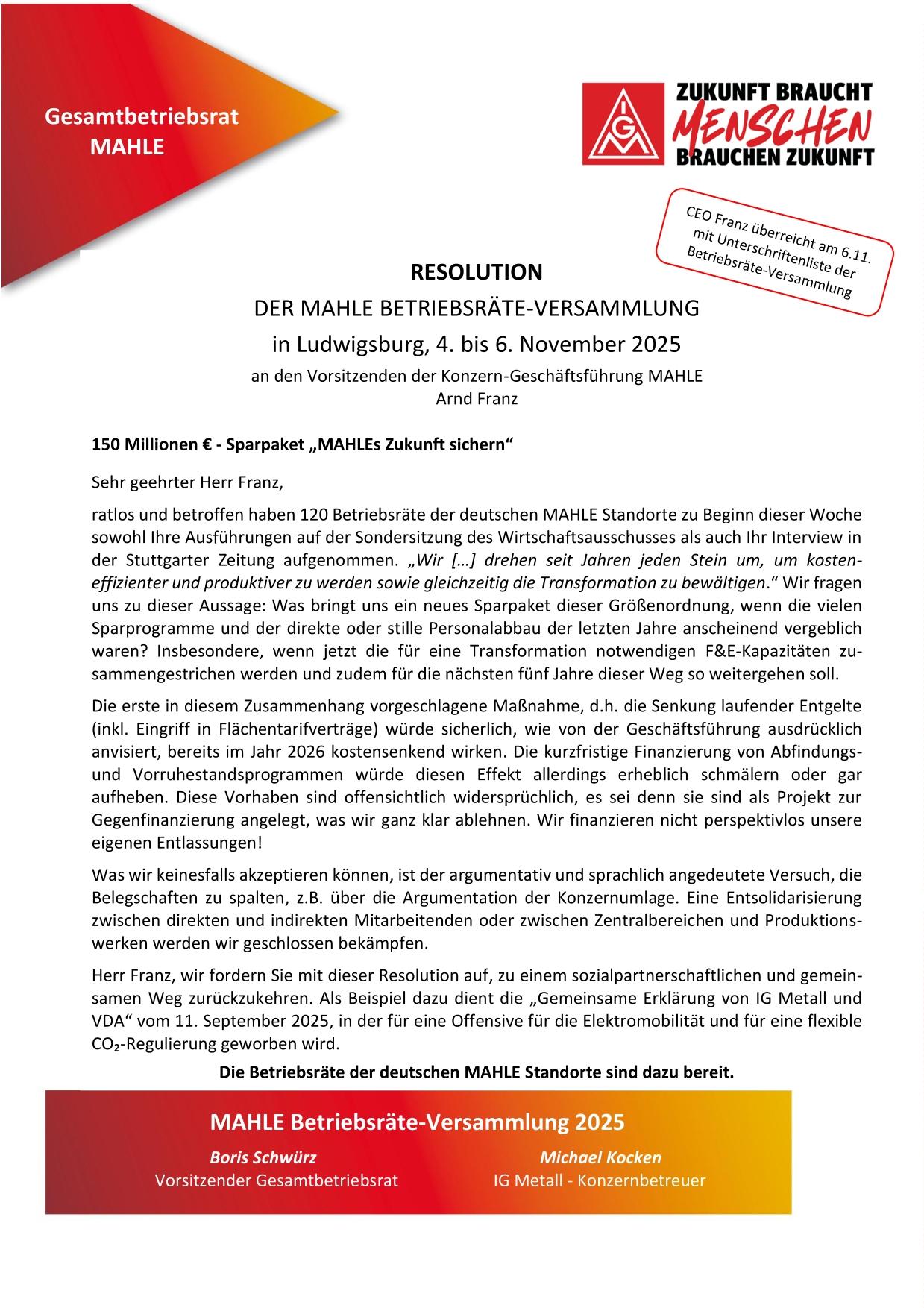 Neben dem heutigen Pressegespräch haben am 4.11.25 die Betriebsräte aller deutschen MAHLE Standorte in der Betriebsrätevollversammlung und am 7.11.25 in der gemeinsamen Betriebsversammlung aller Stuttgarter Standorte dem Arbeitgeber die Rote Karte gezeigt – ein Bestandteil der Kampagne „Zukunft braucht Menschen. Menschen brauchen Zukunft.“ der IG Metall Baden-Württemberg.