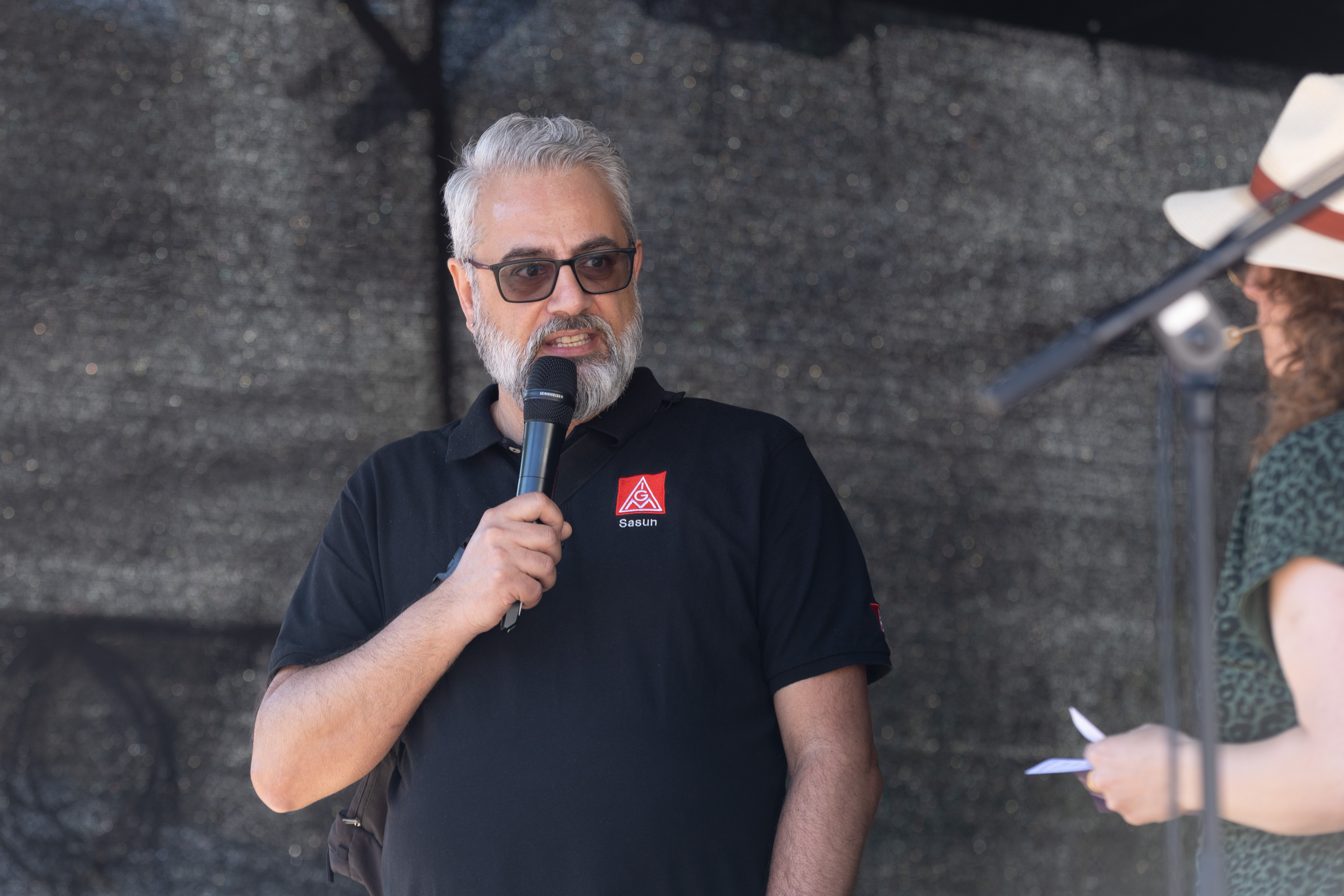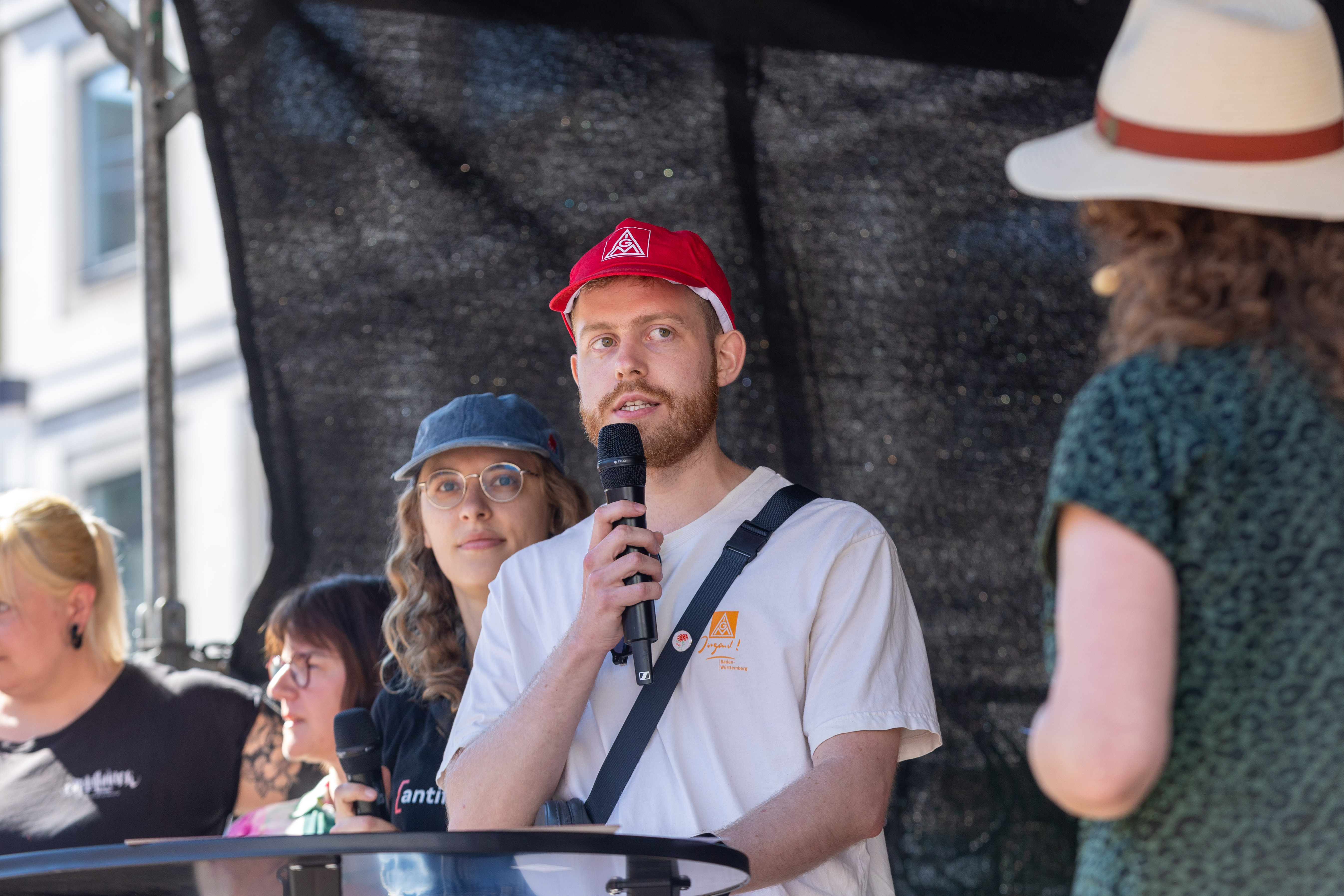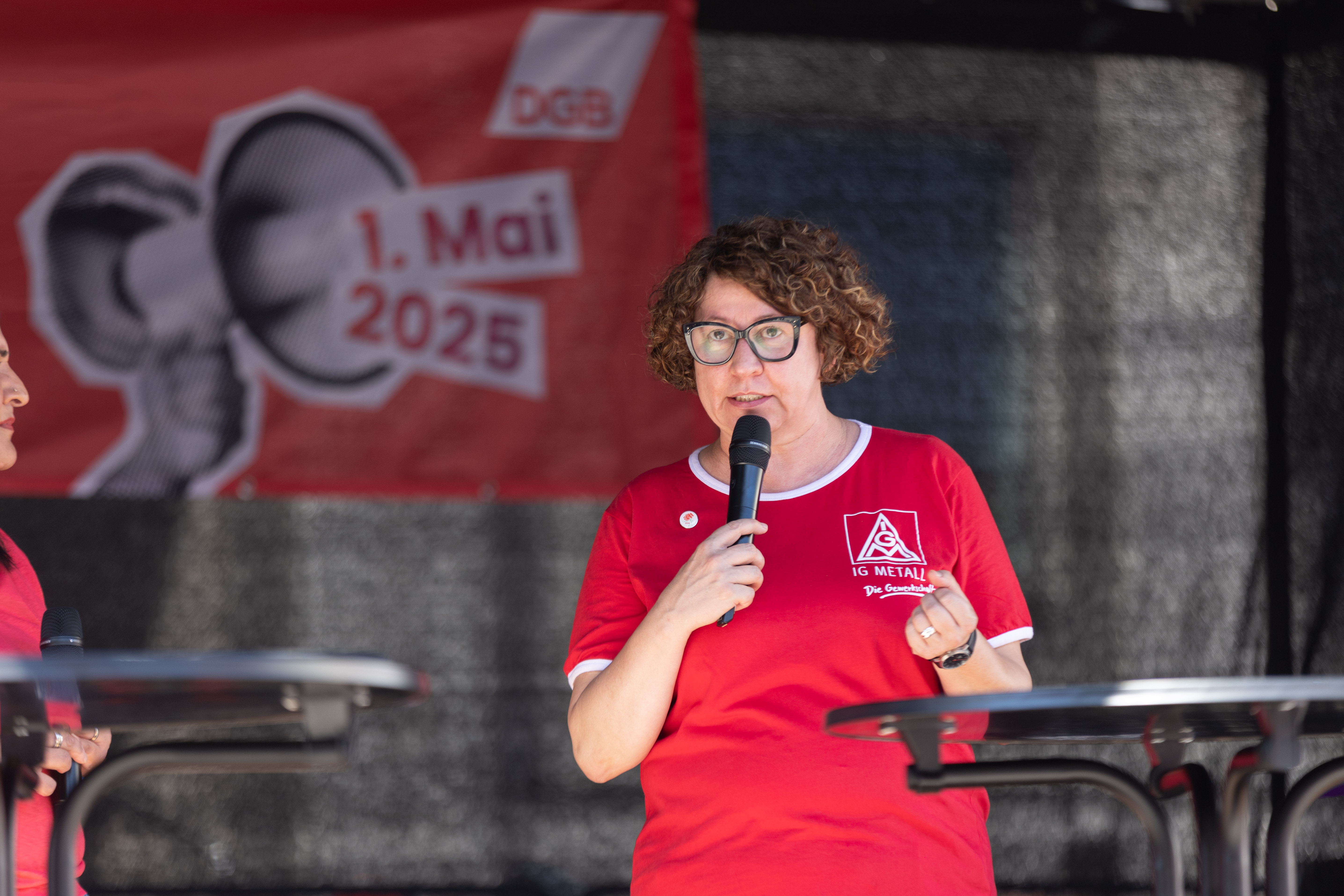 Liane Papaioannou, Erste Bevollmächtigte und Geschäftsführerin der IG Metall Stuttgart auf der Kundgebung: "Gewerkschaftsarbeit bedeutet sich einzumischen - und das nicht nur innerhalb des Betriebs. Wir mischen uns auch in die Politik ein! Nur so und nur wenn wir alle an einem Strang ziehen, werden wir unsere Forderungen nach einer gerechten Arbeitswelt durchsetzen."