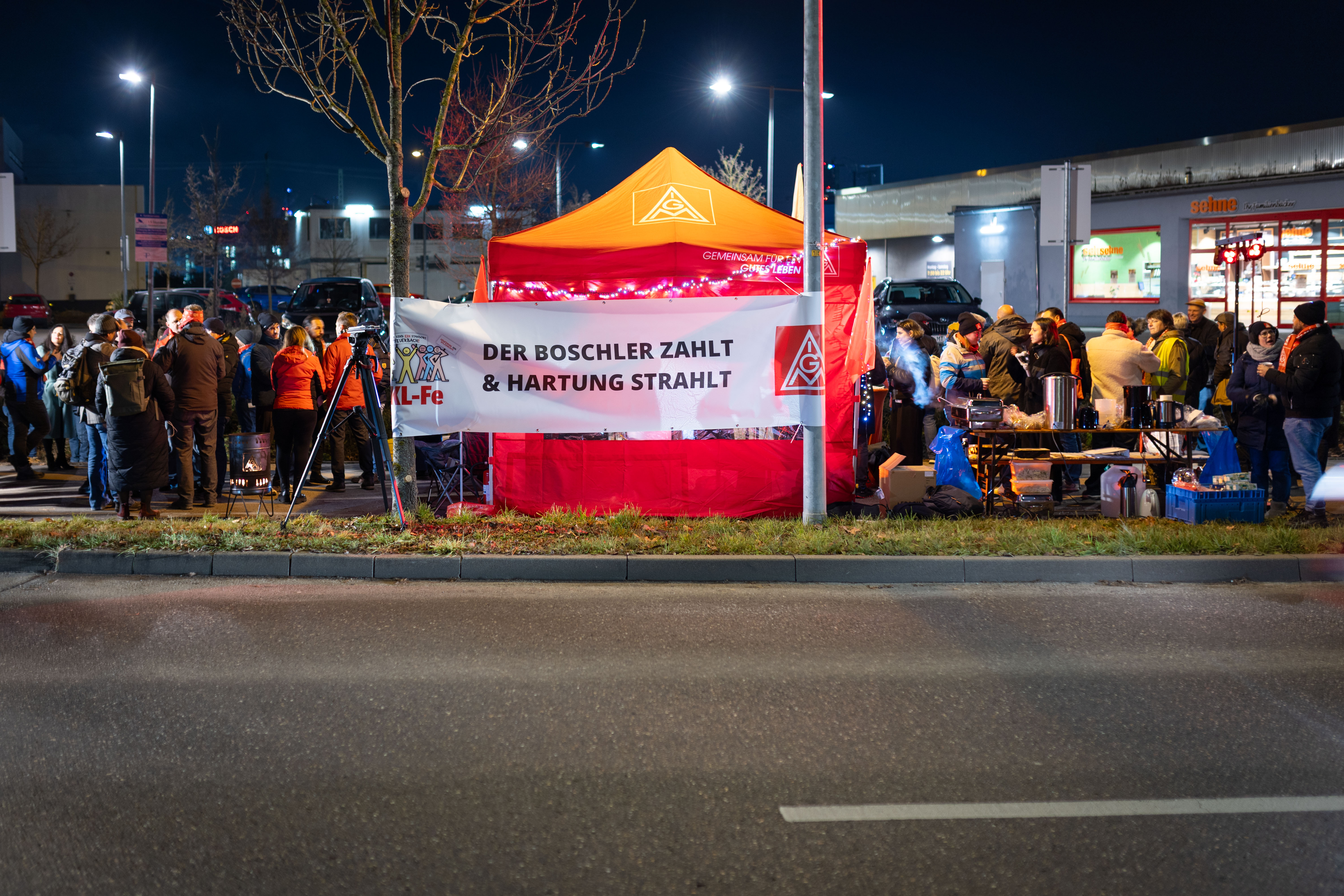 Seit den frühen Morgenstunden (5.30 Uhr) des 3. Dezembers harren die IG Metall Vertrauensleute und Beschäftigte vor dem Feuerbacher Boschstandorts aus. Mit der sogenannten „Zukunftsschicht“, die bis in die Abendstunden des 4. Dezembers – 36 Stunden lang – andauert, zeigen die beteiligten Bosch-Beschäftigten ihren Unmut gegenüber dem im September offiziell verkündeten deutschlandweiten Abbauplänen von 13.000 Stellen. Trotz des Ausschlusses betriebsbedingter Kündigungen bis 2027, wird nun selbst diese Vereinbarung von der Geschäftsführung in Frage gestellt: hinter vorgehaltener Hand wird aktuell von einem Abbau von 22.000 Stellen gesprochen – ein absolutes Novum bei Bosch.
