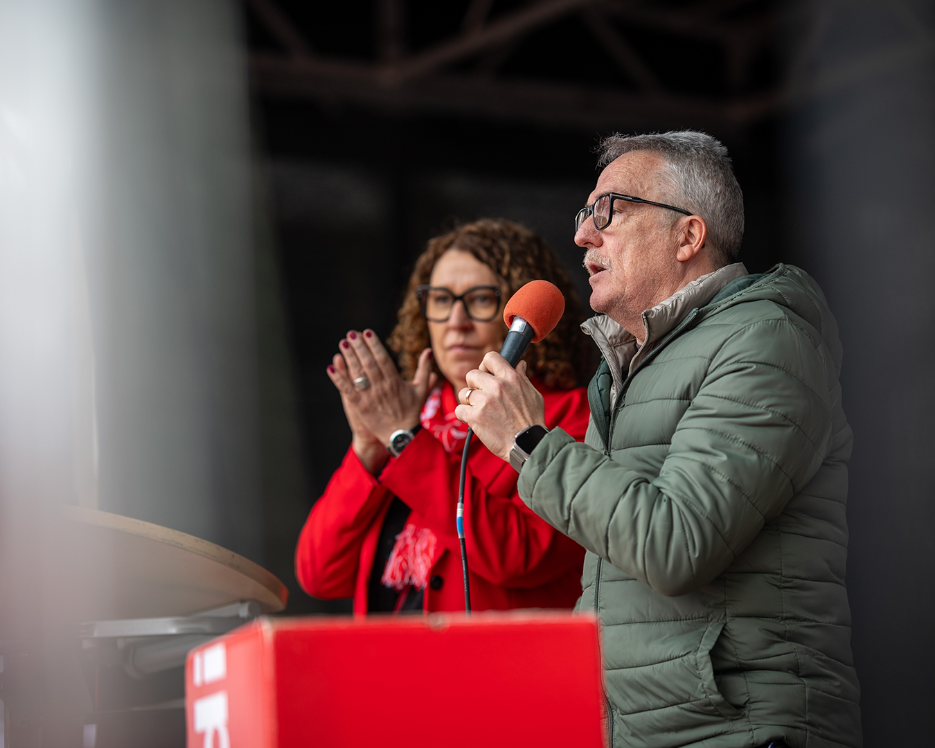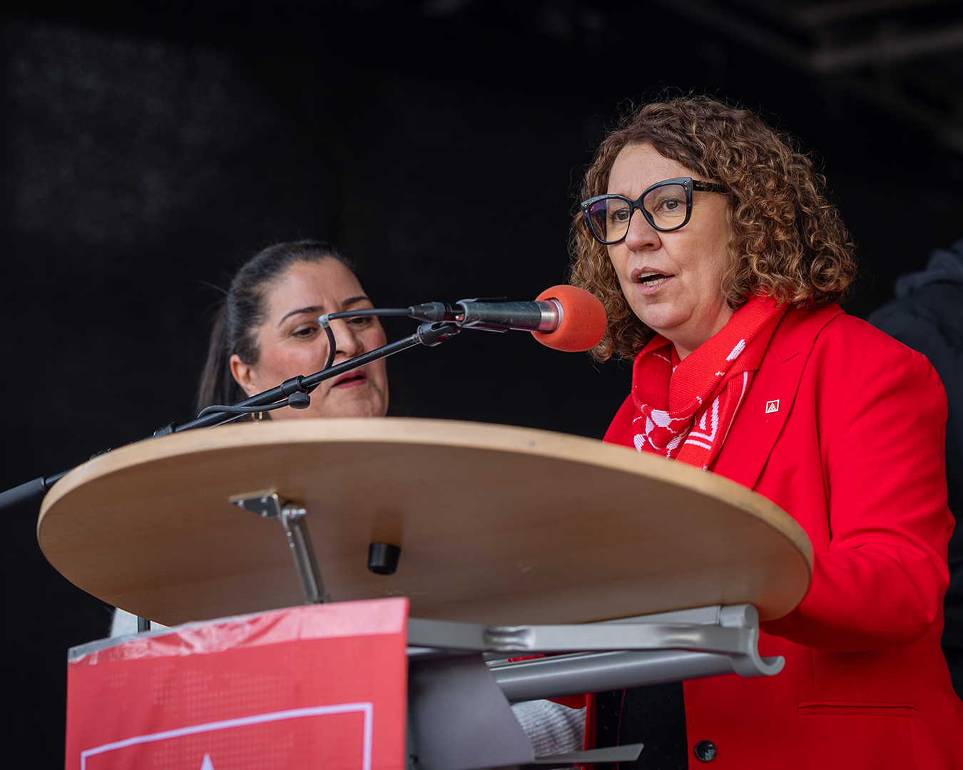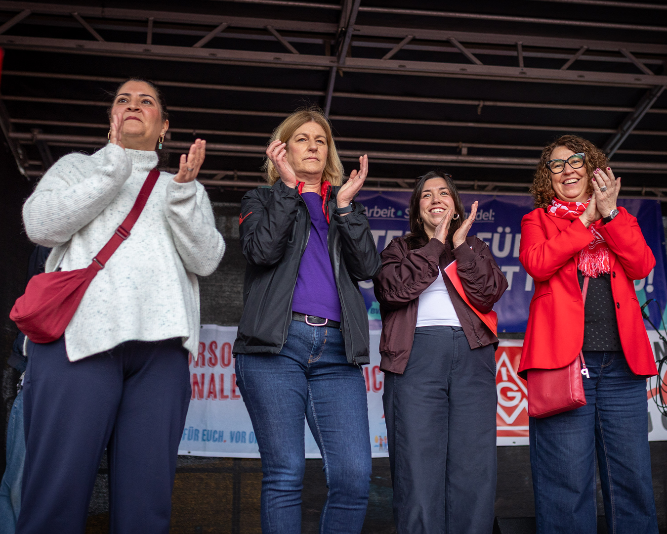 Dort eröffneten Liane Papaioannou, Erste Bevollmächtigte der IG Metall Stuttgart, und Sidar Carman, Geschäftsführerin von ver.di Stuttgart, die Veranstaltung mit einer gemeinsamen Begrüßung. Beide betonten die Bedeutung gewerkschaftlicher Geschlossenheit und machten deutlich, dass es jetzt politische Entscheidungen zugunsten der Beschäftigten brauche.