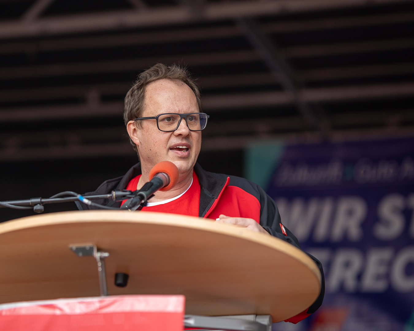 Kai Burmeister, Vorsitzender des DGB Baden‑Württemberg, betonte auf der Bühne, dass die Menschen Investitionen statt Kürzungen erwarteten und dass eine Politik gebraucht werde, die Sicherheit für Beschäftigte, Kommunen und den Industriestandort schafft.