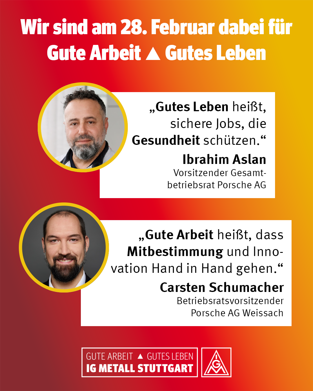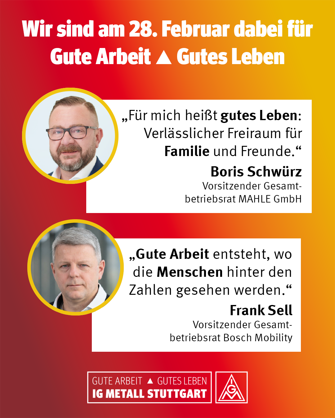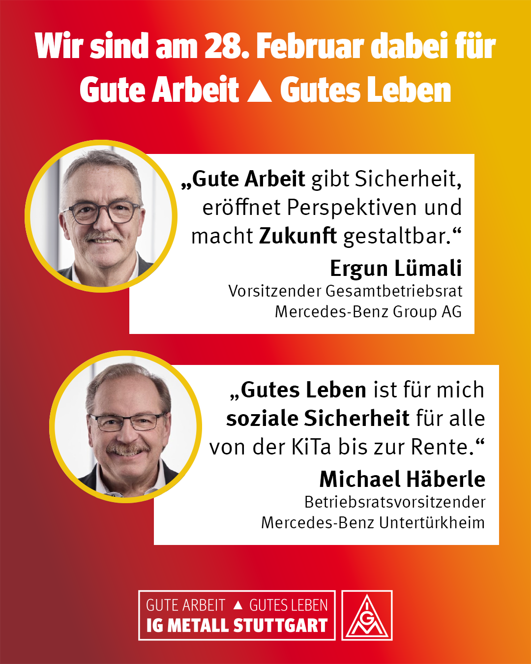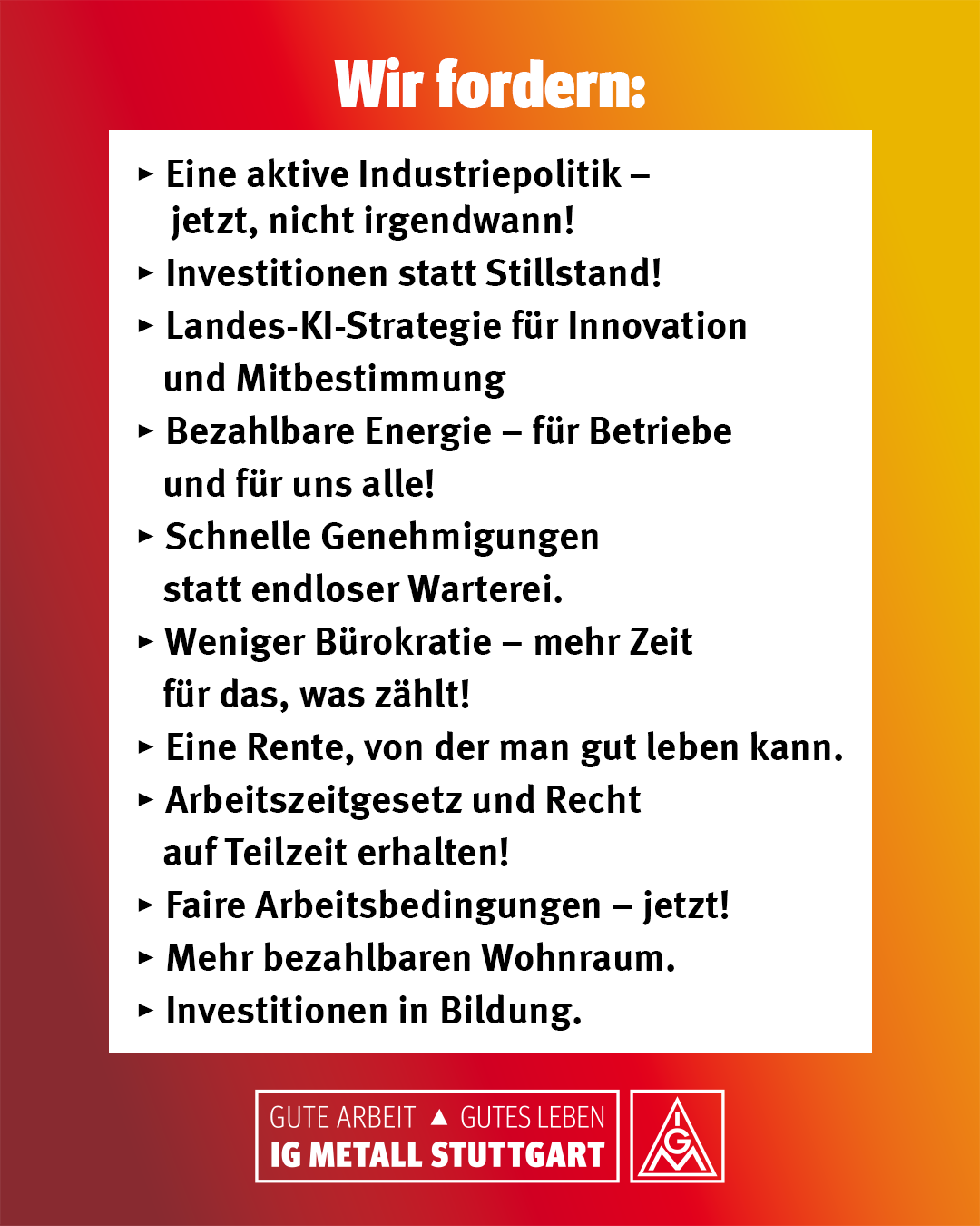 Im Anschluss folgten Reden von Barbara Resch, Bezirksleiterin der IG Metall Baden-Württemberg, und Maike Schollenberger, Landesbezirksleiterin von ver.di Baden-Württemberg, die jeweils aus Sicht ihrer Organisationen klar machten, dass es ohne Investitionen in Industrie, öffentliche Infrastruktur, Qualifizierung und soziale Sicherheit keine stabile Zukunft geben wird.