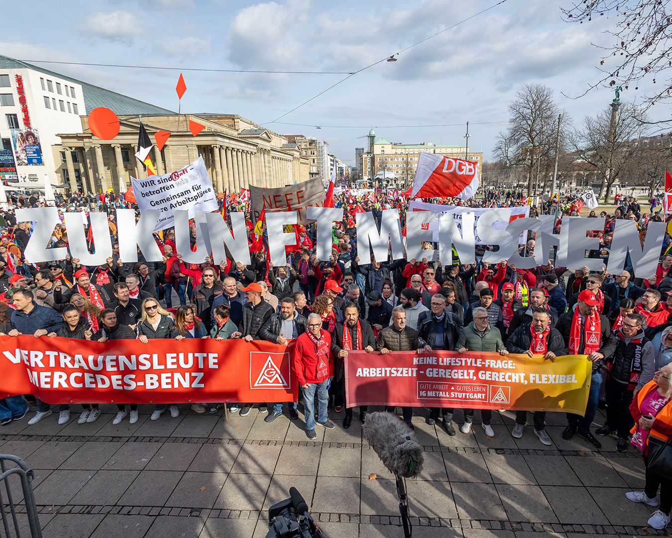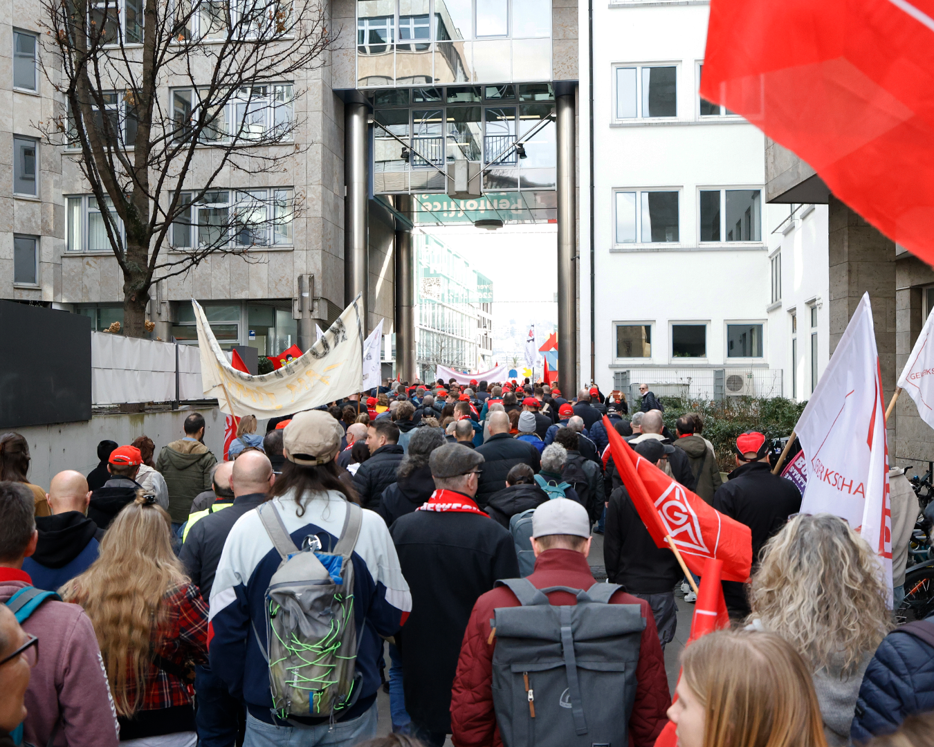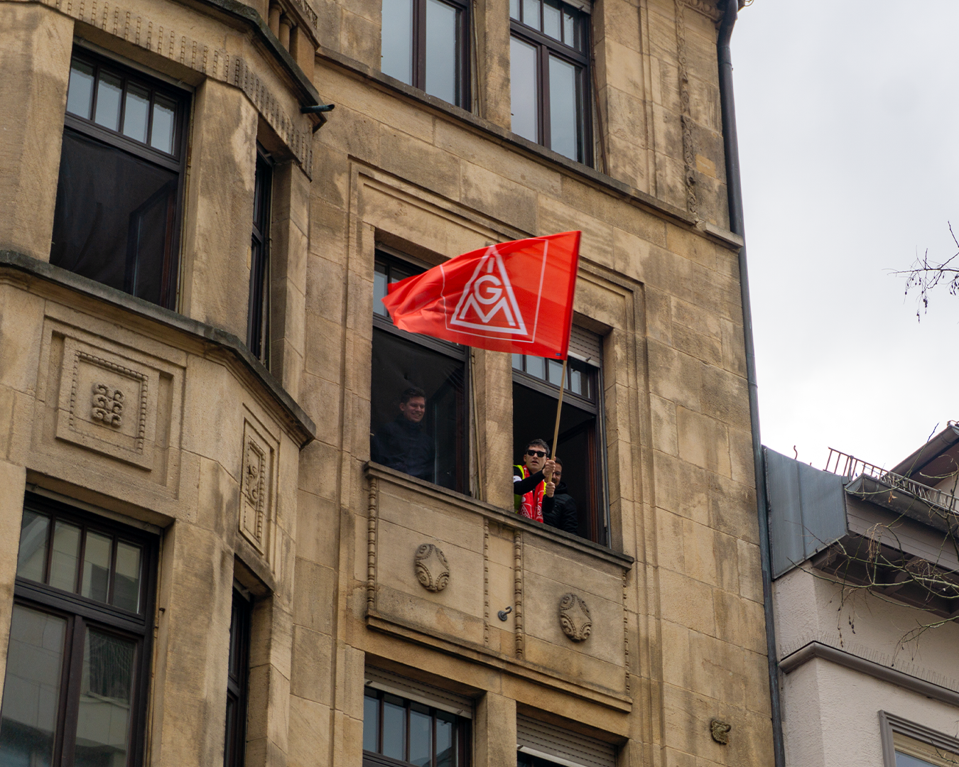 Bereits um 11:30 Uhr füllte sich der Platz vor dem Gewerkschaftshaus. Von dort aus starteten die Aktiven der IG Metall Stuttgart zur Kundgebung am Schlossplatz.
