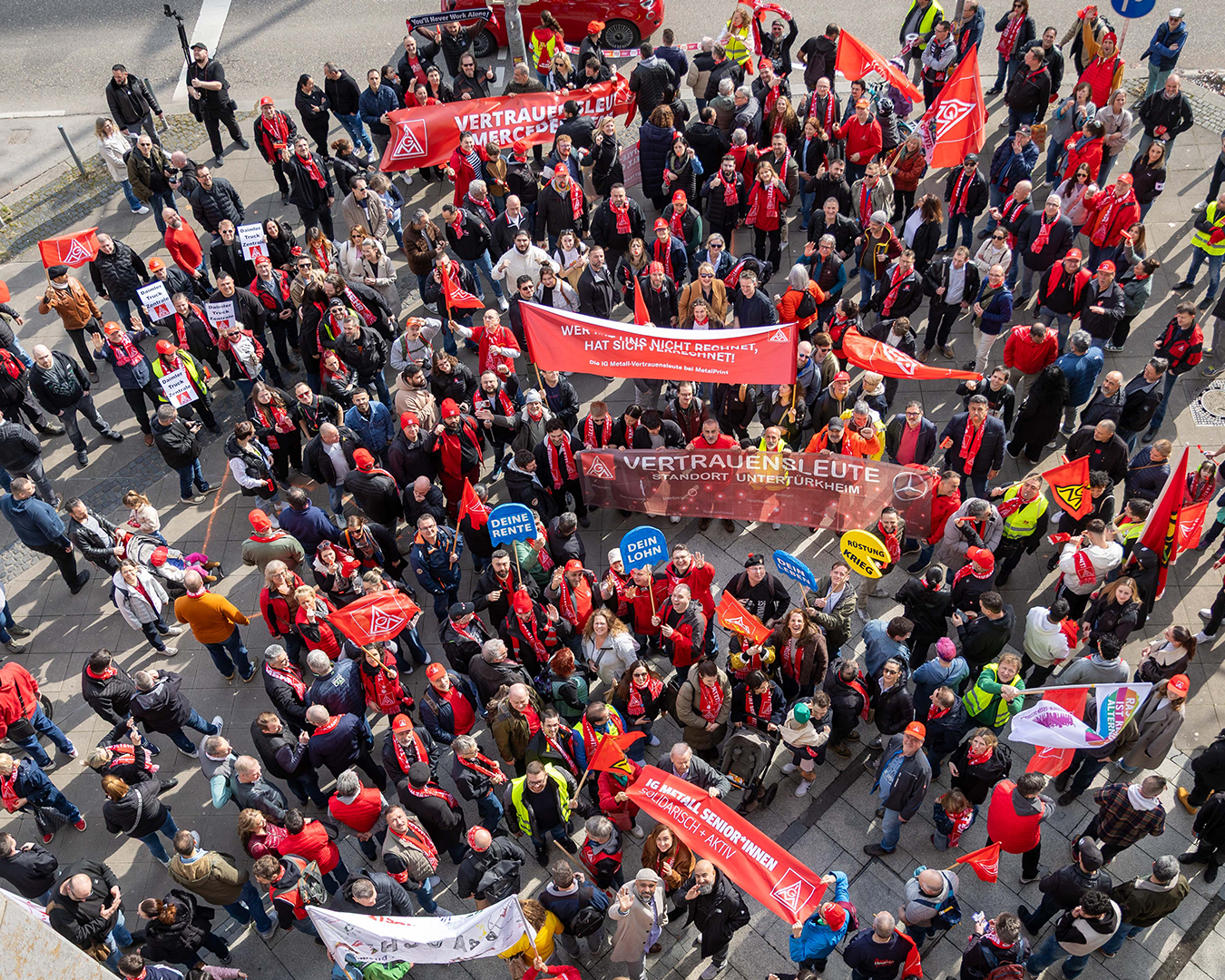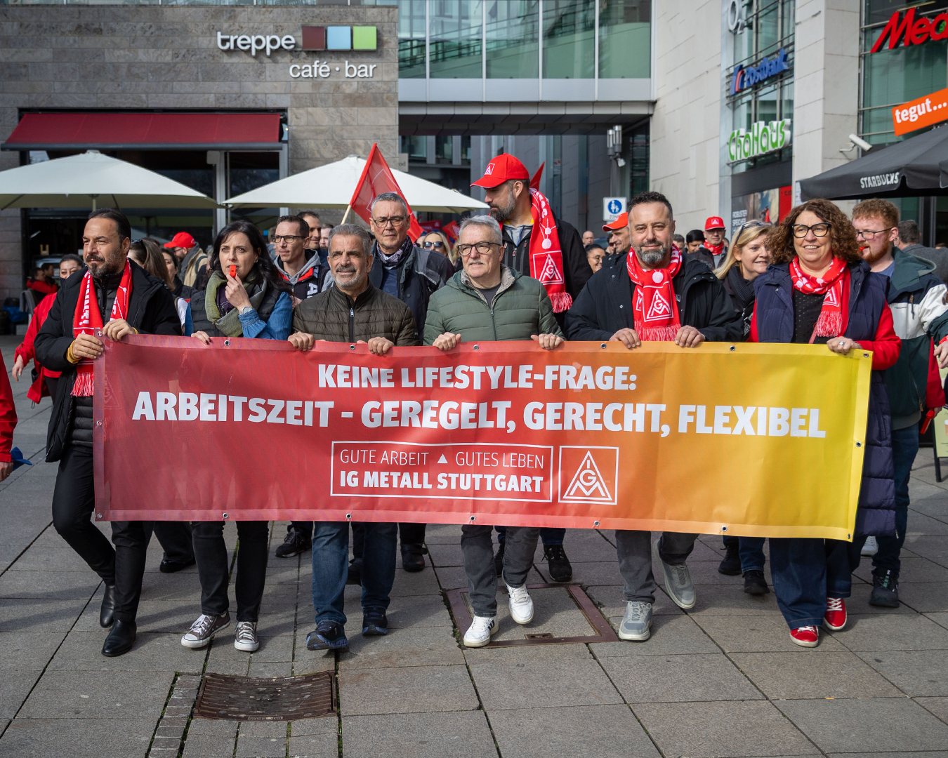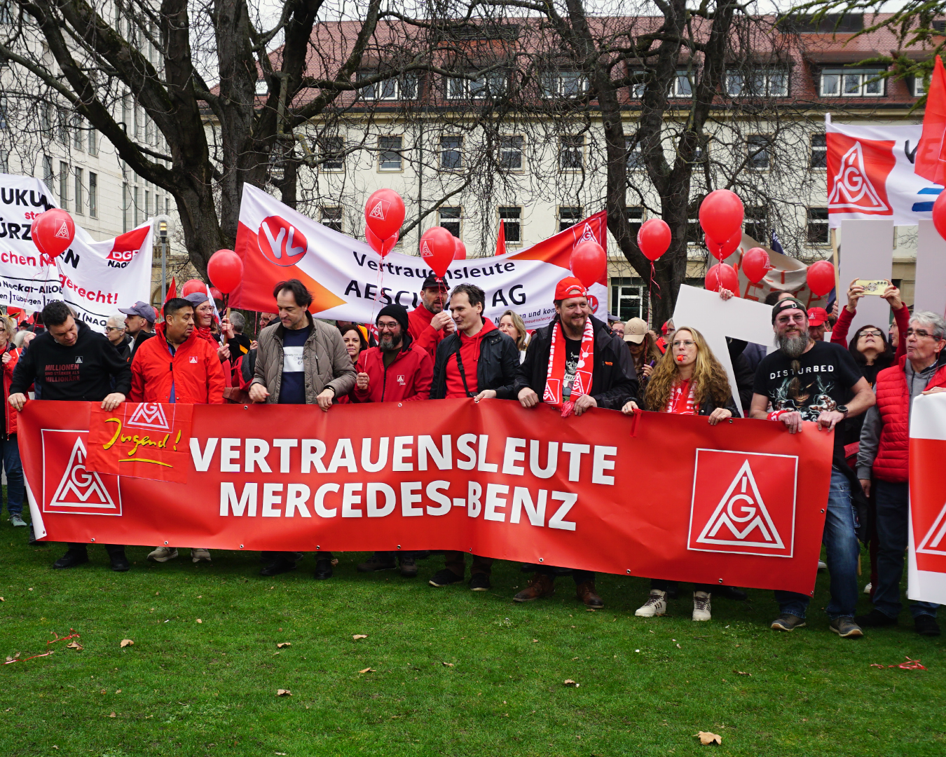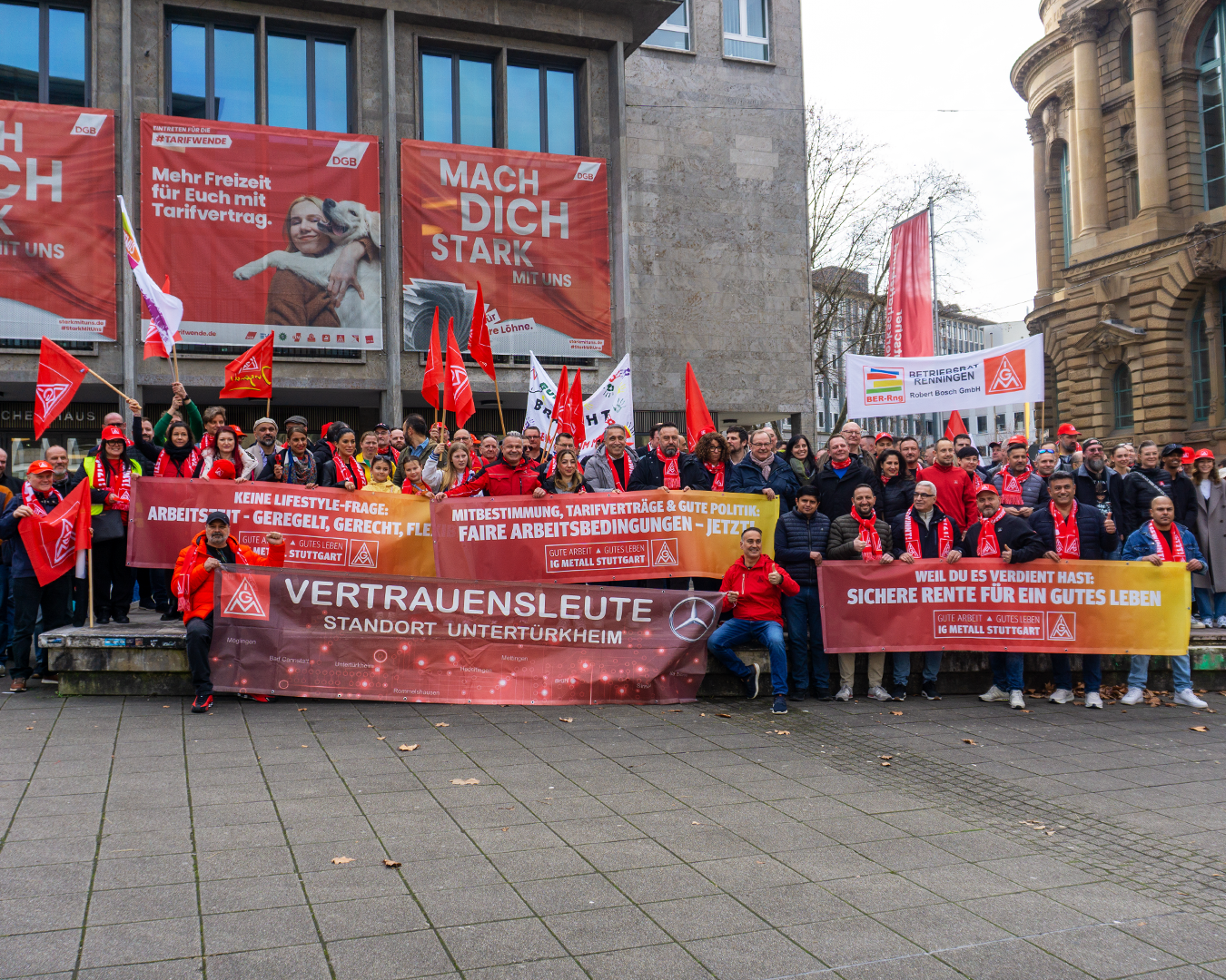 Ein starkes Zeichen setzten auch die Senior*innen der IG Metall Stuttgart. Der Ortssenioren-Ausschuss nahm mit zahlreichen Kolleginnen und Kollegen im Alter zwischen 63 und über 90 Jahren an der Kundgebung teil. Solidarisch an der Seite der aktiven Kolleginnen und Kollegen machten sie deutlich, dass gute Arbeit, ein gutes Leben und ein würdiges Leben im Ruhestand zusammengehören.