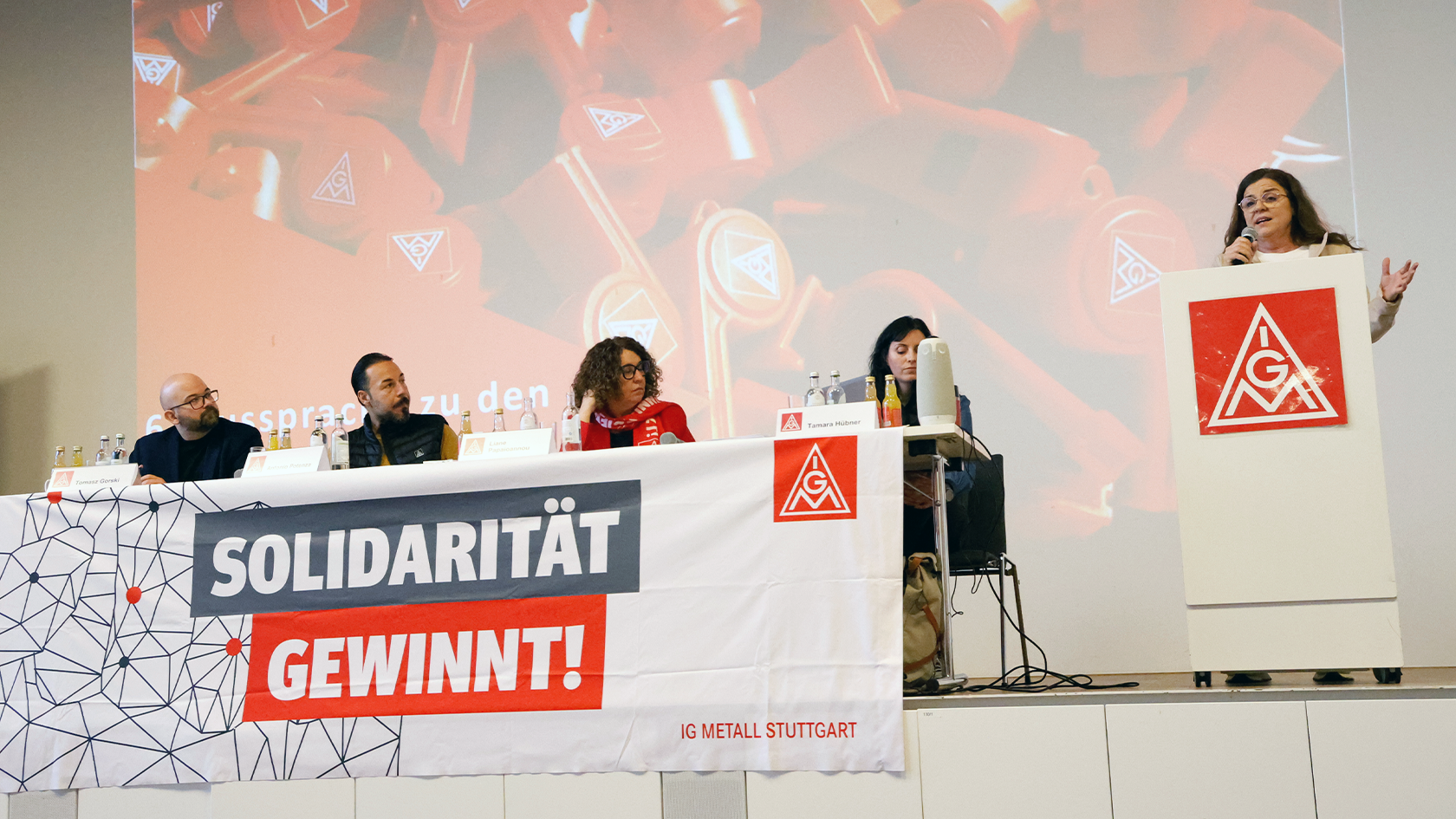 Liane Papaioannou, Erste Bevollmächtigte und Geschäftsführerin der IG Metall Stuttgart, eröffnete die Versammlung mit einem politischen Bericht. Dabei ging sie auf die anstehenden Landtagswahlen und die aktuelle Wirtschaftspolitik ein. Ein besonderer Fokus lag auf der Arbeitsmarktpolitik.
